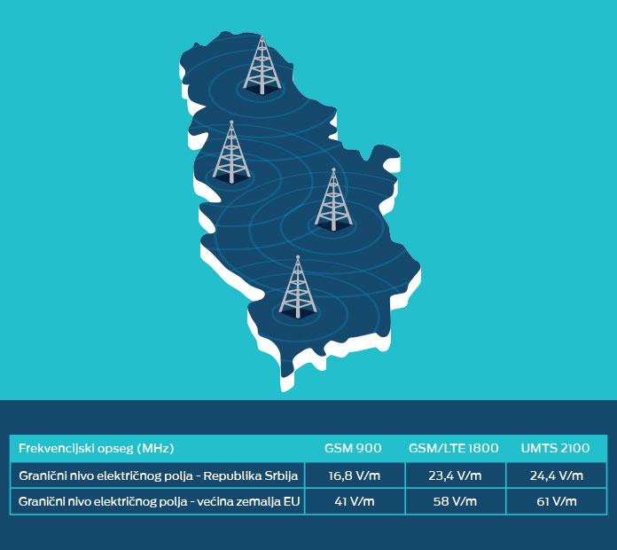 U svakoj zemlji postoje zakoni koji određuju graničnu vrednost jačine zračenja na mestima na kojima se može naći čovek, a kod nas je to Zakon o zaštiti od nejonizujućih zračenja. Tim zakonom propisane su granične vrednosti u Srbiji, koje su znatno manje od preporučenih standarda koje postavlja Međunarodna komisija za zaštitu od nejonizujućeg zračenja i koje podržava Svetska zdravstvena organizacija.